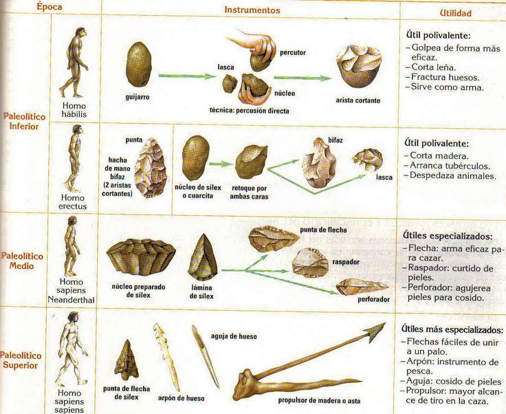 Los útiles del Paleolítico se usaban en las tareas de obtención de alimentos y de protección. Se hacían de madera, hueso o piedra. La piedra más usada era el sílex, que era golpeada para tallarla. Durante esta etapa, se perfeccionó la talla y se elaboraron herramientas cada vez más precisas. Esto permitió que aparecieran útiles especializados en las diferentes tareas.